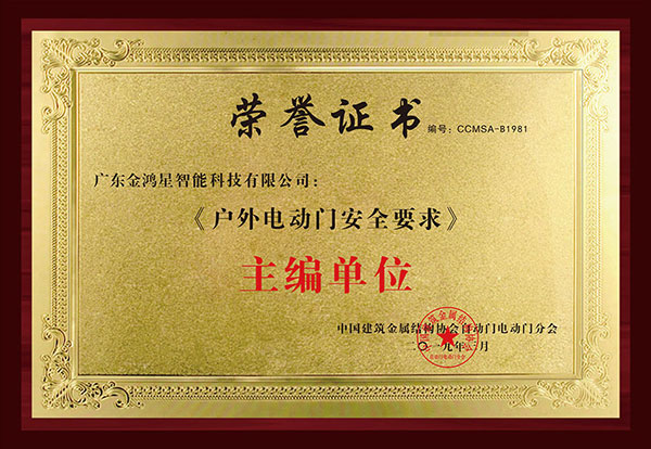 金鴻星做為戶外電動門安全標準踐行者,先后成為《戶外電動門安全要求》、《戶外智能平移門》團體標準主起草單位、并榮獲《全國戶外智能平移門生產(chǎn)示范企業(yè)》“國家高新技術(shù)企業(yè)”“2020年佛山高新區(qū)制造業(yè)單打冠軍”“廣東省守合同重信用企業(yè)”“佛山市專精特新企業(yè)”“廣東省知識產(chǎn)權(quán)示范企業(yè)”等諸多榮譽稱號,獲得了行業(yè)及政府機構(gòu)的一致認可。